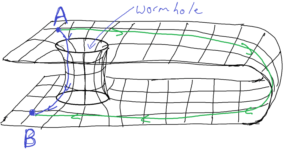 It only took a few months following the general relativity publication for Karl Schwarzchild and Hendrik Lorentz to publish solutions to Einstein’s field equations for a point mass, effectively describing a black hole (though the general concept in the classical sense had been proposed over a century earlier). This extreme warping of spacetime eventually gave rise to another idea where by two points on a plane could be brought together through a shorter tube. In 1957 John Wheeler coined the term “wormhole.” In principle, this solved the distance dilemma.