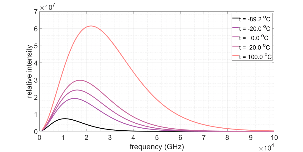 In this graph, I’ve generated a plot of specrta–intensity of the frequency of light radiated from an object at a given temperature. Each curve corresponds to a temperature encountered here on Earth. The coldest recorded natural temperature, for example was about -89.2°C (-128.6°F) recorded in July 21, 1983 in Antarctica. What the graph shows is that as temperature increases, so does the overall energy radiated (the area under the curve), and spectrum shifts to the right–toward higher frequencies. For terrestrial temperatures, these emissions are in the infrared section of the electromagnetic spectrum. When you get up to several thousand Kelvin in temperature, the emissions are visible light. Our sun, for example, has a surface temperature of 5778 K, and obviously is the source of our light here on Earth.